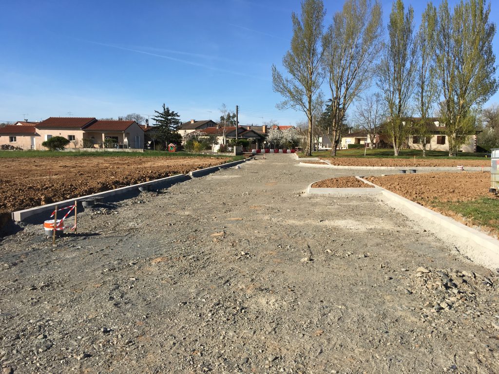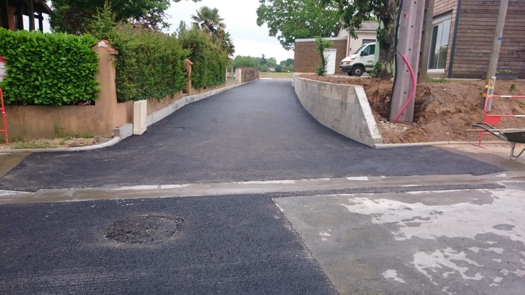 La finition de la voirie du lotissement a été réalisé en enrobé, avec des trottoirs en béton balayé, après avoir posé des bordures, franchissables, avec regards avaloirs (bordures T1 / A2 / caniveau CS1, blocs plein allégés en limite de propriété).